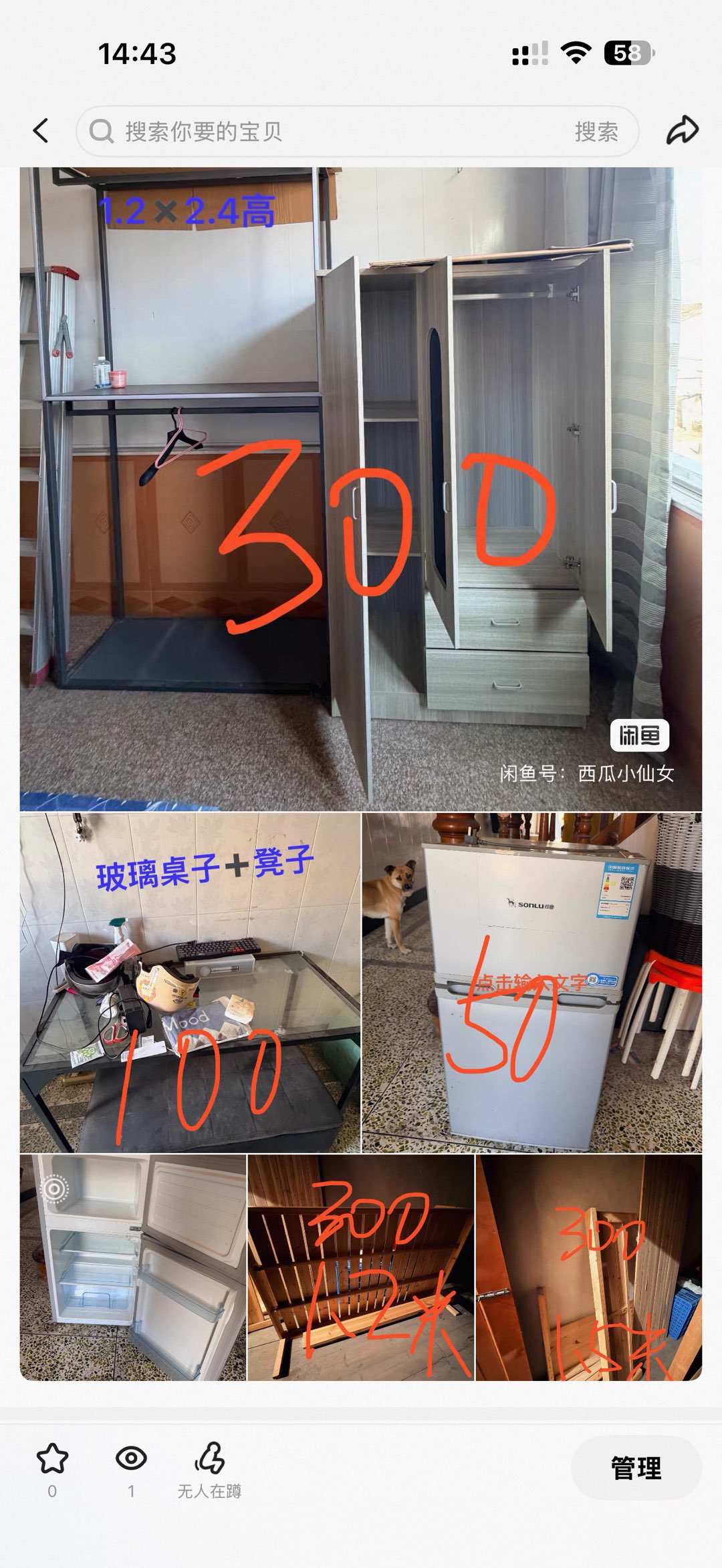 搬家急出。位置在东山铁桥加油站 冰箱50 桌子加凳子100 两个衣柜300 两个床300。