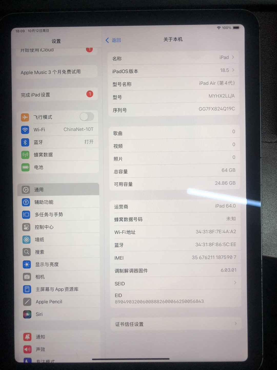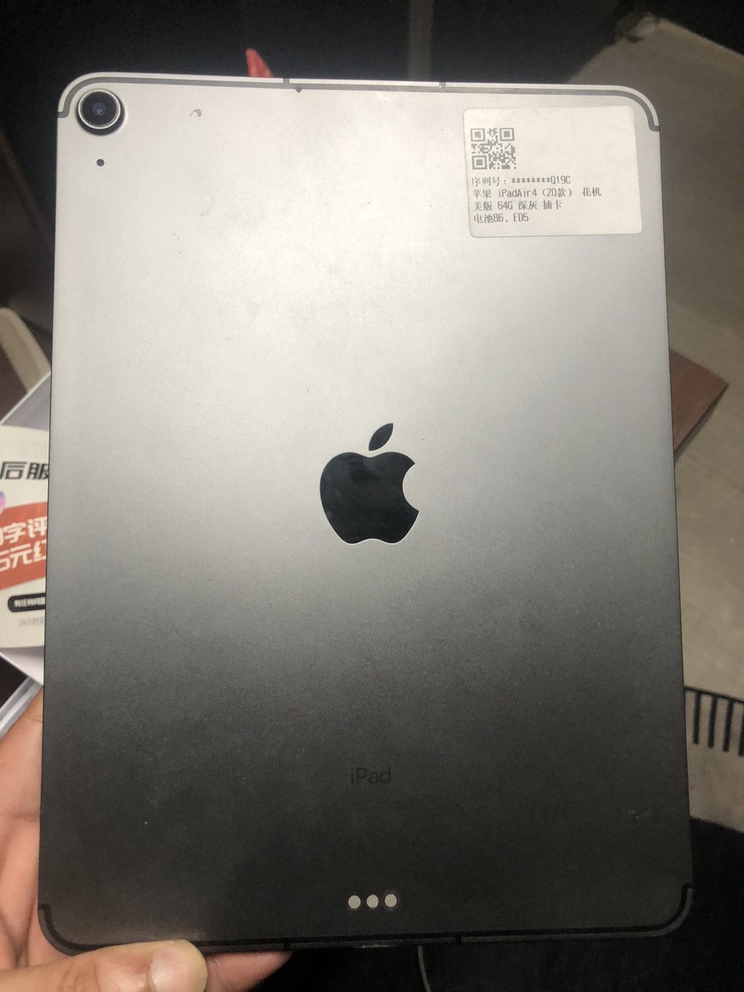 iPadAir4(20款)美版64G 深灰 插卡 电池86